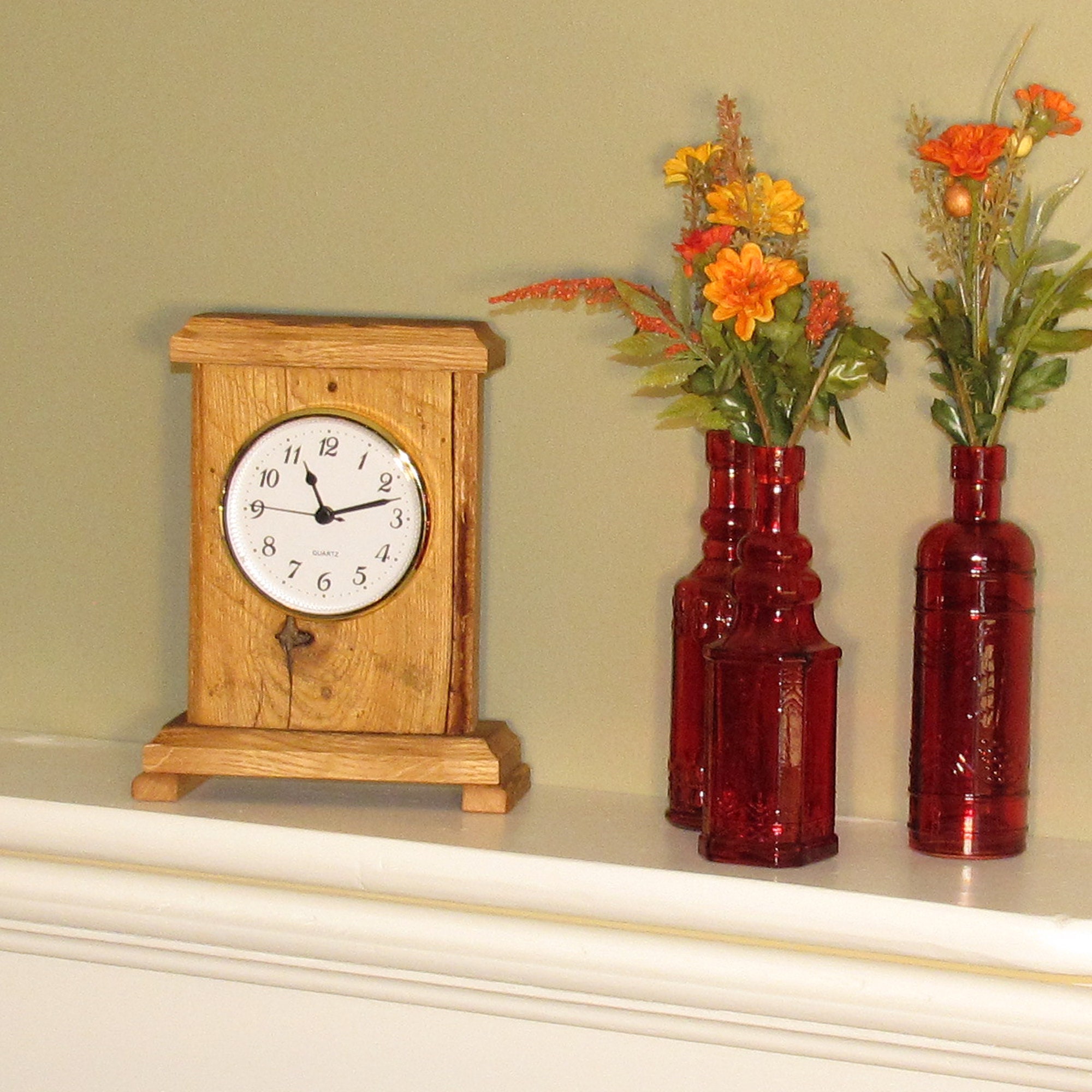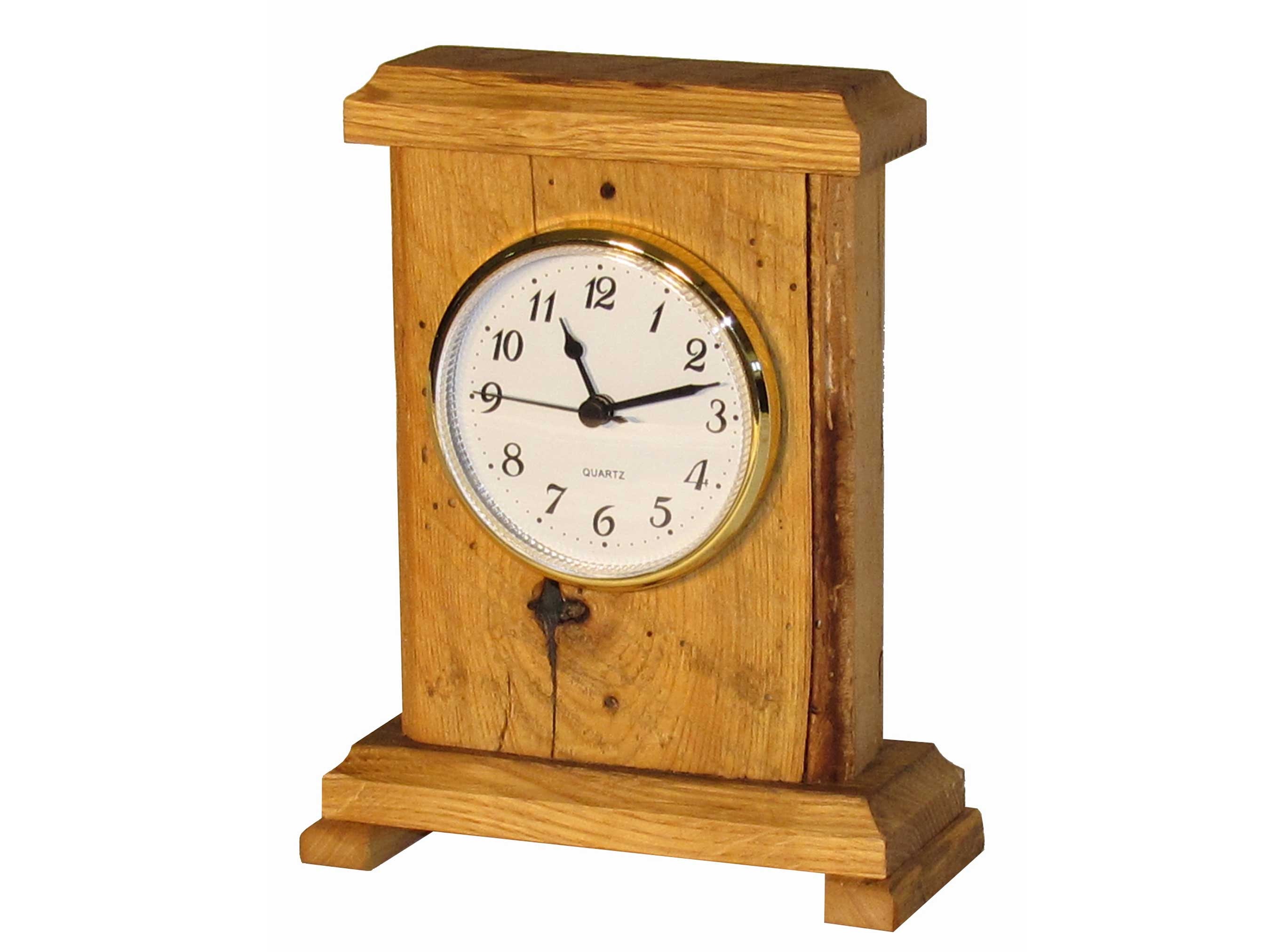 Reclaimed barn wood mantle clock with 3 3/4" diameter dial. Clock is manufactured using reclaimed oak barn wood from the Ohio, Indiana and Kentucky area. The beauty of reclaimed wood are the knots, splits, weathering, nail holes, worm holes and cracks. The characteristics of the wood used in each clock are unique. No two clocks are the same and they are truly one-of-a-kind. Each clock is finished using tongue oil to bring out the natural beauty of the wood color and grain.