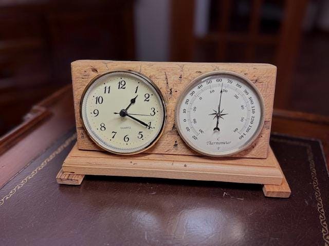 Reclaimed barn wood clock and temperature with 3 3/4" diameter dials. Clock base is manufactured using reclaimed oak barn wood from the Ohio, Indiana and Kentucky area. The beauty of reclaimed wood are the knots, splits, weathering, nail holes, worm holes and cracks. The characteristics of the wood used in each clock are unique. No two clocks are the same and they are truly one-of-a-kind. Each clock is finished using tongue oil to bring out the natural beauty of the wood color and grain.